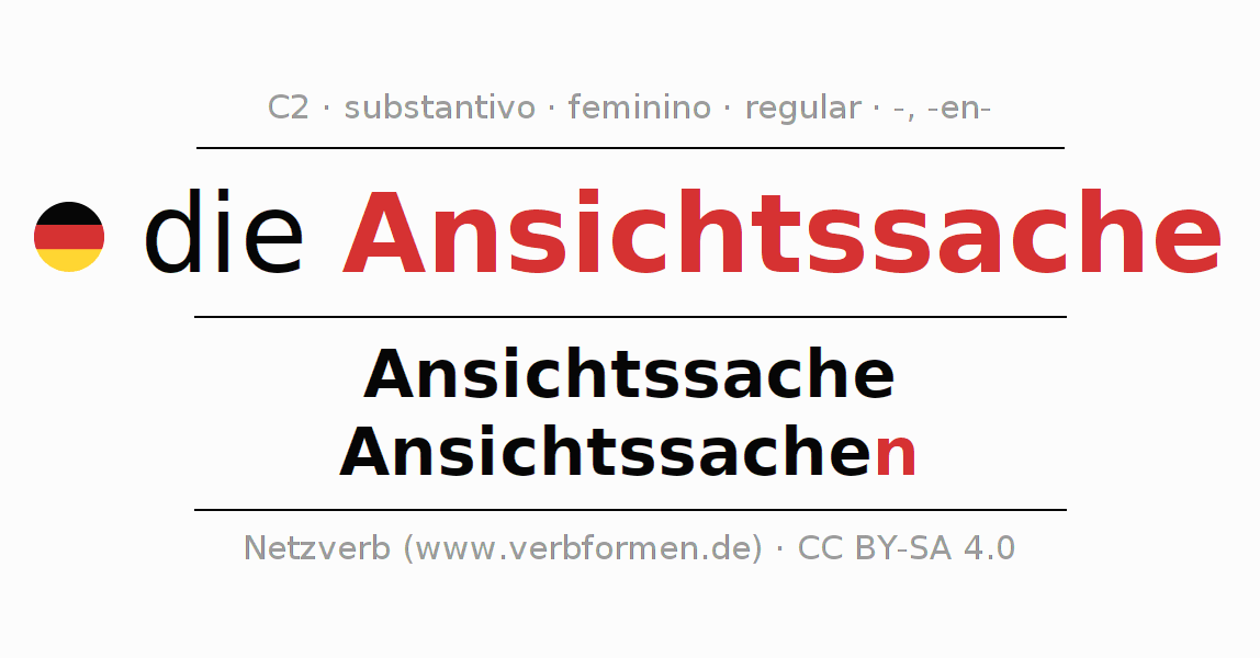 Declinação de Ansichtssache é apresentada em uma tabela com todas as formas no singular e no plural (plural) e em todos os quatro casos: nominativo (1º caso), genitivo (2º caso), dativo (3º caso) e acusativo (4º caso) . Especialmente para os alunos de alemão, a correta declinação da palavra Ansichtssache é fundamental.