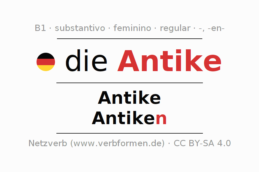 Declinação de Antike é apresentada em uma tabela com todas as formas no singular e no plural (plural) e em todos os quatro casos: nominativo (1º caso), genitivo (2º caso), dativo (3º caso) e acusativo (4º caso) . Especialmente para os alunos de alemão, a correta declinação da palavra Antike é fundamental.
