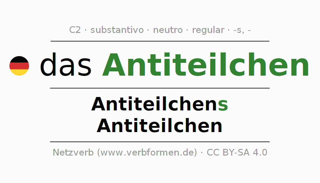 A declinação do substantivo Antiteilchen (antipartícula) está no genitivo singular Antiteilchens e no nominativo plural Antiteilchen . O substantivo forte Antiteilchen é declinado com a terminação s/-. O gênero gramatical de Antiteilchen é neutro e o artigo definido é "das". Não se pode somente declinar o substantivo Antiteilchen mas sim todos os substantivos em alemão. O substantivo faz parte do vocabulário referente ao Certificado em Alemão do Nível C2. Comentários ☆