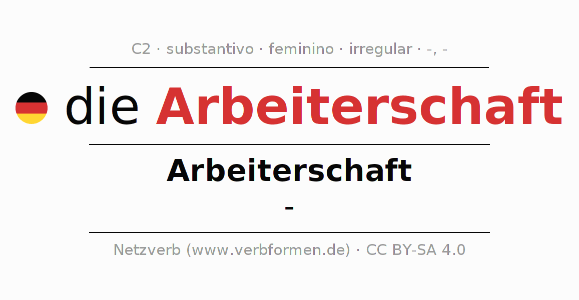 A declinação do substantivo Arbeiterschaft (classe trabalhadora, trabalhadores) está no genitivo singular Arbeiterschaft e no nominativo plural - . O substantivo Arbeiterschaft é declinado com as terminações -/-. Não há formas no plural. O gênero gramatical de Arbeiterschaft é feminino e o artigo definido é "die". Não se pode somente declinar o substantivo Arbeiterschaft mas sim todos os substantivos em alemão. O substantivo faz parte do vocabulário referente ao Certificado em Alemão do Nível C2. Comentários ☆