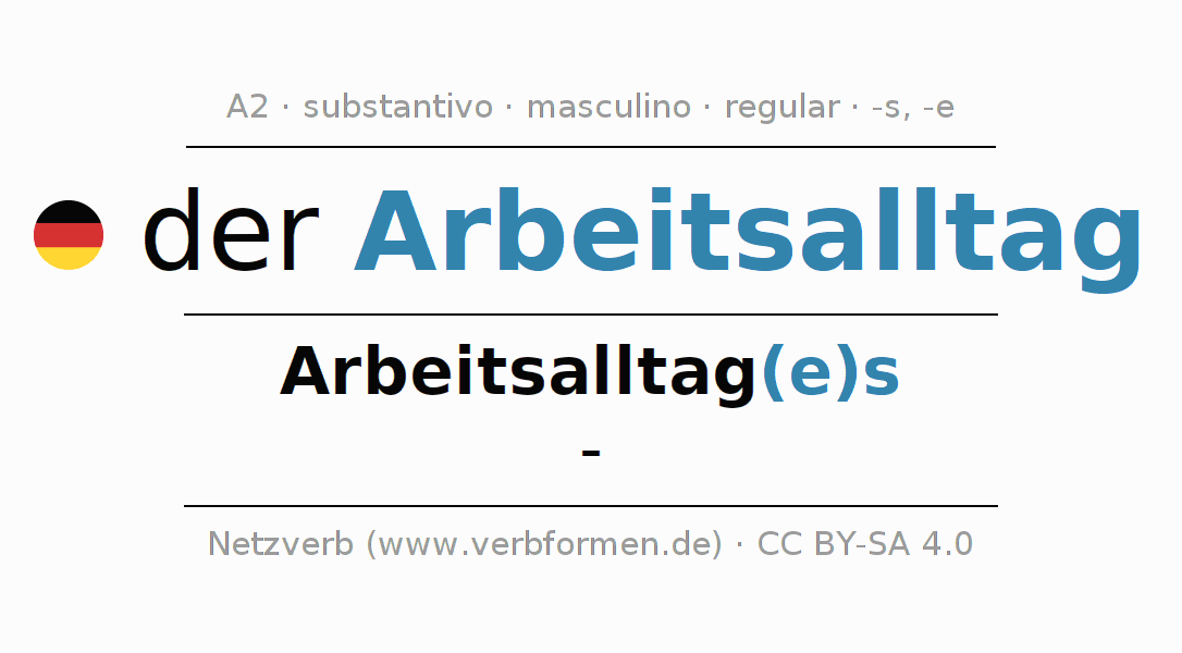 A declinação do substantivo Arbeitsalltag (rotina de trabalho, cotidiano laboral) está no genitivo singular Arbeitsalltag(e)s e no nominativo plural - . O substantivo forte Arbeitsalltag é declinado com a terminação es/-. Não há formas no plural. O gênero gramatical de Arbeitsalltag é masculino e o artigo definido é 'der'. Não se pode somente declinar o substantivo Arbeitsalltag mas sim todos os substantivos em alemão. O substantivo faz parte do vocabulário referente ao Certificado em Alemão do Nível A2. Comentários ☆