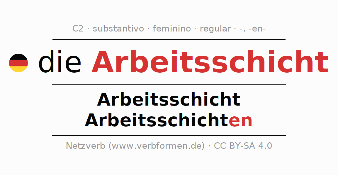 A declinação do substantivo Arbeitsschicht (turno) está no genitivo singular Arbeitsschicht e no nominativo plural Arbeitsschichten . O substantivo fraco Arbeitsschicht é declinado com a terminação -/en. O gênero gramatical de Arbeitsschicht é feminino e o artigo definido é "die". Não se pode somente declinar o substantivo Arbeitsschicht mas sim todos os substantivos em alemão. O substantivo faz parte do vocabulário referente ao Certificado em Alemão do Nível C2. Comentários ☆