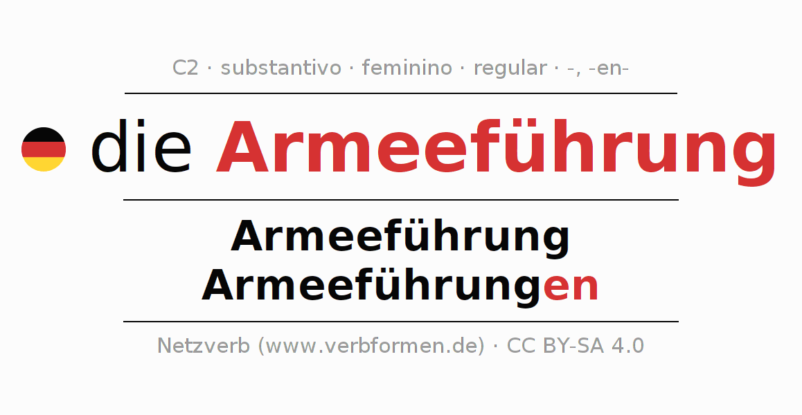 A declinação do substantivo Armeeführung (comando militar, direção militar) está no genitivo singular Armeeführung e no nominativo plural Armeeführungen . O substantivo fraco Armeeführung é declinado com a terminação -/en. O gênero gramatical de Armeeführung é feminino e o artigo definido é "die". Não se pode somente declinar o substantivo Armeeführung mas sim todos os substantivos em alemão. O substantivo faz parte do vocabulário referente ao Certificado em Alemão do Nível C2. Comentários ☆