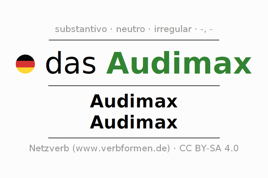 A declinação do substantivo Audimax (auditório, sala de aula) está no genitivo singular Audimax e no nominativo plural Audimax . O substantivo Audimax é declinado com as terminações -/-. O gênero gramatical de Audimax é neutro e o artigo definido é "das". Não se pode somente declinar o substantivo Audimax mas sim todos os substantivos em alemão. Comentários ☆
