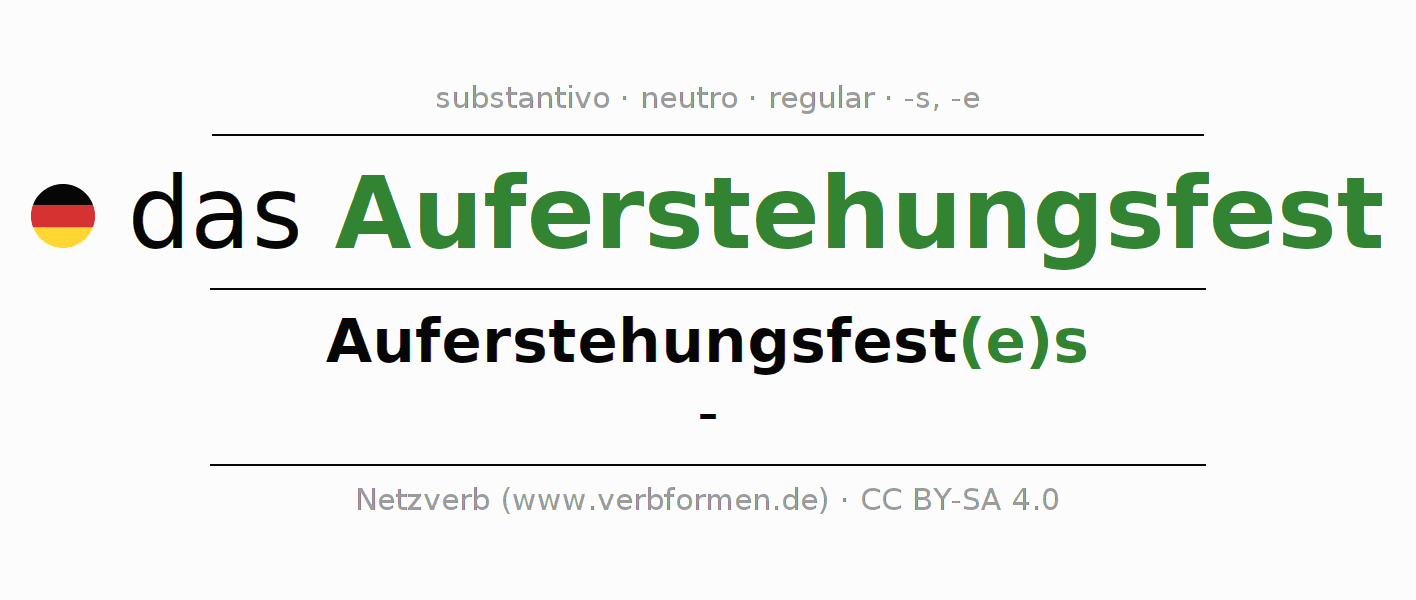 A declinação do substantivo Auferstehungsfest (Páscoa) está no genitivo singular Auferstehungsfest(e)s e no nominativo plural - . O substantivo forte Auferstehungsfest é declinado com a terminação es/-. Não há formas no plural. O gênero gramatical de Auferstehungsfest é neutro e o artigo definido é "das". Não se pode somente declinar o substantivo Auferstehungsfest mas sim todos os substantivos em alemão. Comentários ☆