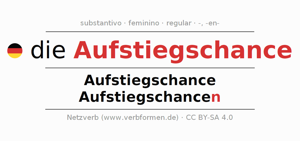 A declinação do substantivo Aufstiegschance (oportunidade de ascensão) está no genitivo singular Aufstiegschance e no nominativo plural Aufstiegschancen . O substantivo fraco Aufstiegschance é declinado com a terminação -/n. O gênero gramatical de Aufstiegschance é feminino e o artigo definido é "die". Não se pode somente declinar o substantivo Aufstiegschance mas sim todos os substantivos em alemão. Comentários ☆