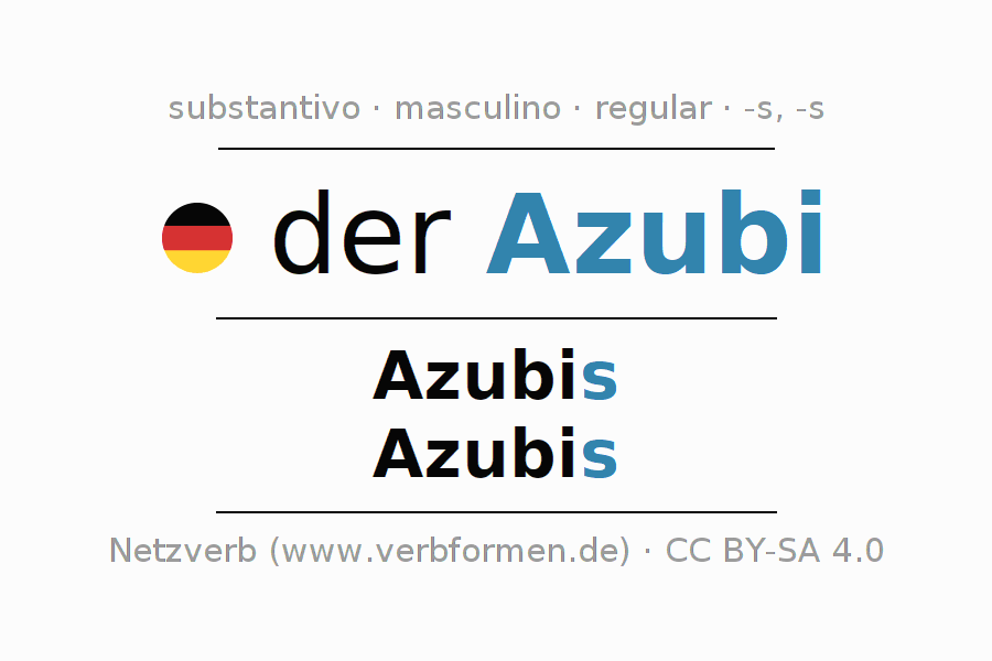 A declinação do substantivo Azubi (aprendiz, estagiário) está no genitivo singular Azubis e no nominativo plural Azubis . O substantivo forte Azubi é declinado com a terminação s/s. Mas pode também ser usado para outros fins. O gênero gramatical de Azubi é masculino e o artigo definido é 'der'. O substantivo também pode ser usado com outros géneros e outros artigos. Não se pode somente declinar o substantivo Azubi mas sim todos os substantivos em alemão. Comentários ☆