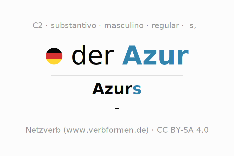 A declinação do substantivo Azur (azul, azul-celeste) está no genitivo singular Azurs e no nominativo plural - . O substantivo forte Azur é declinado com a terminação s/-. Não há formas no plural. O gênero gramatical de Azur é masculino e o artigo definido é 'der'. Não se pode somente declinar o substantivo Azur mas sim todos os substantivos em alemão. O substantivo faz parte do vocabulário referente ao Certificado em Alemão do Nível C2. Comentários ☆