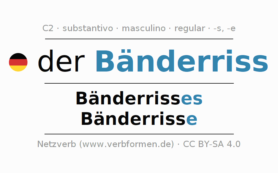 Declinação de Bänderriss é apresentada em uma tabela com todas as formas no singular e no plural (plural) e em todos os quatro casos: nominativo (1º caso), genitivo (2º caso), dativo (3º caso) e acusativo (4º caso) . Especialmente para os alunos de alemão, a correta declinação da palavra Bänderriss é fundamental.