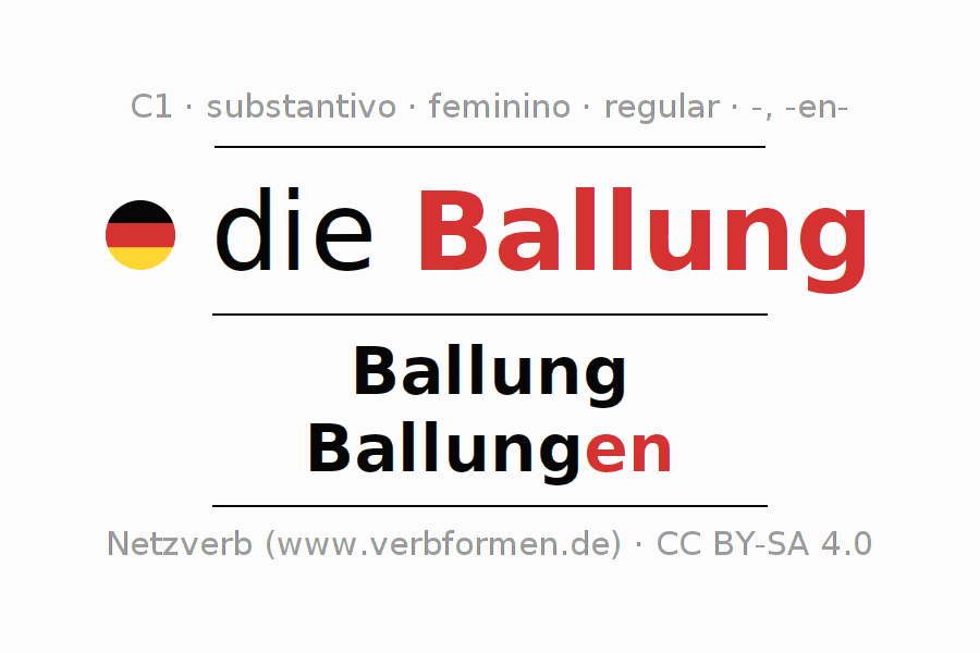 Declinação de Ballung é apresentada em uma tabela com todas as formas no singular e no plural (plural) e em todos os quatro casos: nominativo (1º caso), genitivo (2º caso), dativo (3º caso) e acusativo (4º caso) . Especialmente para os alunos de alemão, a correta declinação da palavra Ballung é fundamental.