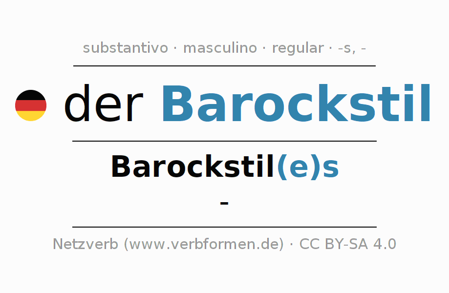 A declinação do substantivo Barockstil (estilo barroco) está no genitivo singular Barockstil(e)s e no nominativo plural - . O substantivo forte Barockstil é declinado com a terminação es/-. Não há formas no plural. O gênero gramatical de Barockstil é masculino e o artigo definido é 'der'. Não se pode somente declinar o substantivo Barockstil mas sim todos os substantivos em alemão. Comentários ☆