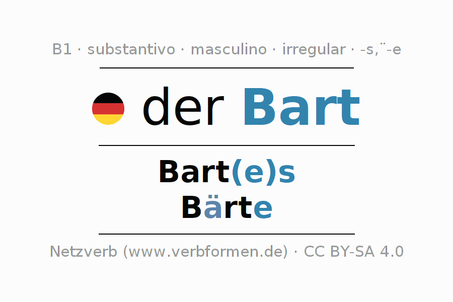 Declinação de Bart é apresentada em uma tabela com todas as formas no singular e no plural (plural) e em todos os quatro casos: nominativo (1º caso), genitivo (2º caso), dativo (3º caso) e acusativo (4º caso) . Especialmente para os alunos de alemão, a correta declinação da palavra Bart é fundamental.