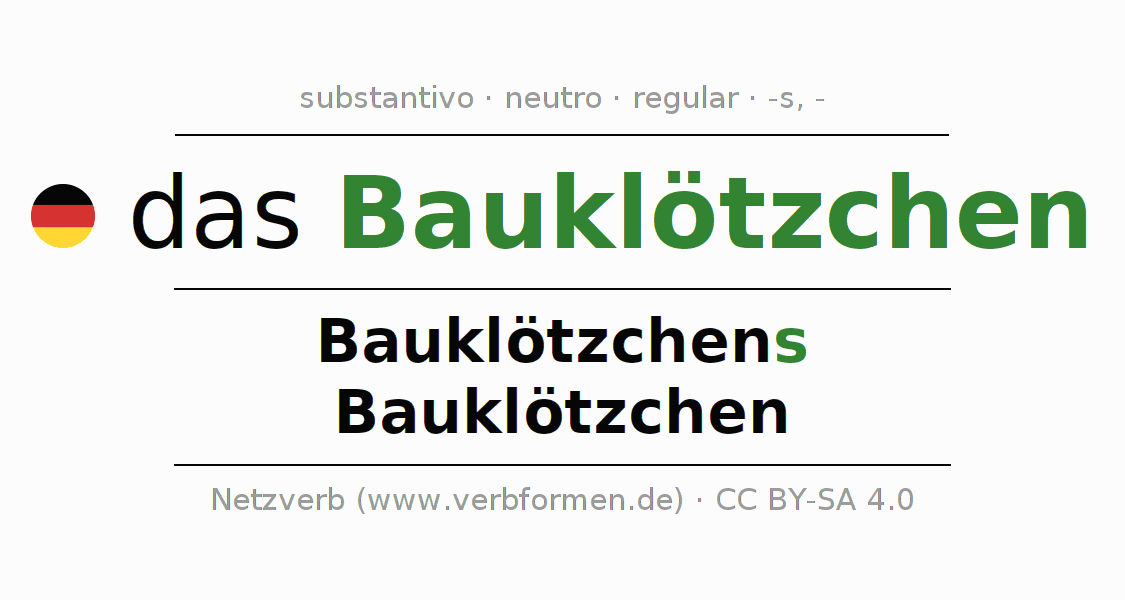 A declinação do substantivo Bauklötzchen (cubos de madeira, peças de madeira) está no genitivo singular Bauklötzchens e no nominativo plural Bauklötzchen . O substantivo forte Bauklötzchen é declinado com a terminação s/-. O gênero gramatical de Bauklötzchen é neutro e o artigo definido é "das". Não se pode somente declinar o substantivo Bauklötzchen mas sim todos os substantivos em alemão. Comentários ☆