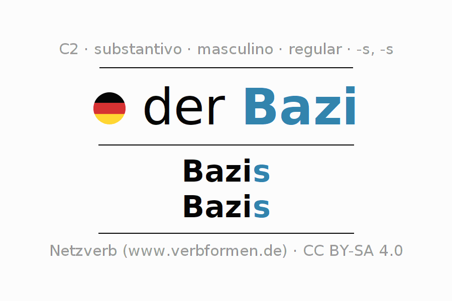 Declinação de Bazi é apresentada em uma tabela com todas as formas no singular e no plural (plural) e em todos os quatro casos: nominativo (1º caso), genitivo (2º caso), dativo (3º caso) e acusativo (4º caso) . Especialmente para os alunos de alemão, a correta declinação da palavra Bazi é fundamental.