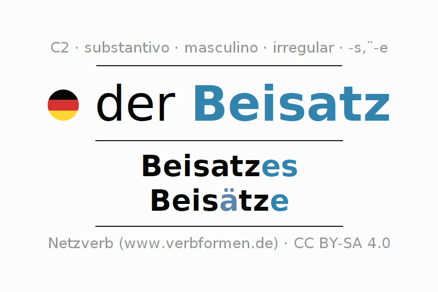 A declinação do substantivo Beisatz (aposição) está no genitivo singular Beisatzes e no nominativo plural Beisätze . O substantivo forte Beisatz é declinado com a terminação es/ä-e. No plural com um trema. O gênero gramatical de Beisatz é masculino e o artigo definido é 'der'. Não se pode somente declinar o substantivo Beisatz mas sim todos os substantivos em alemão. O substantivo faz parte do vocabulário referente ao Certificado em Alemão do Nível C2. Comentários ☆