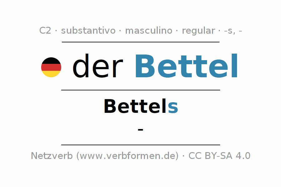 A declinação do substantivo Bettel (Bettelspiel, coisas velhas) está no genitivo singular Bettels e no nominativo plural - . O substantivo forte Bettel é declinado com a terminação s/-. Não há formas no plural. O gênero gramatical de Bettel é masculino e o artigo definido é 'der'. Não se pode somente declinar o substantivo Bettel mas sim todos os substantivos em alemão. O substantivo faz parte do vocabulário referente ao Certificado em Alemão do Nível C2. Comentários ☆