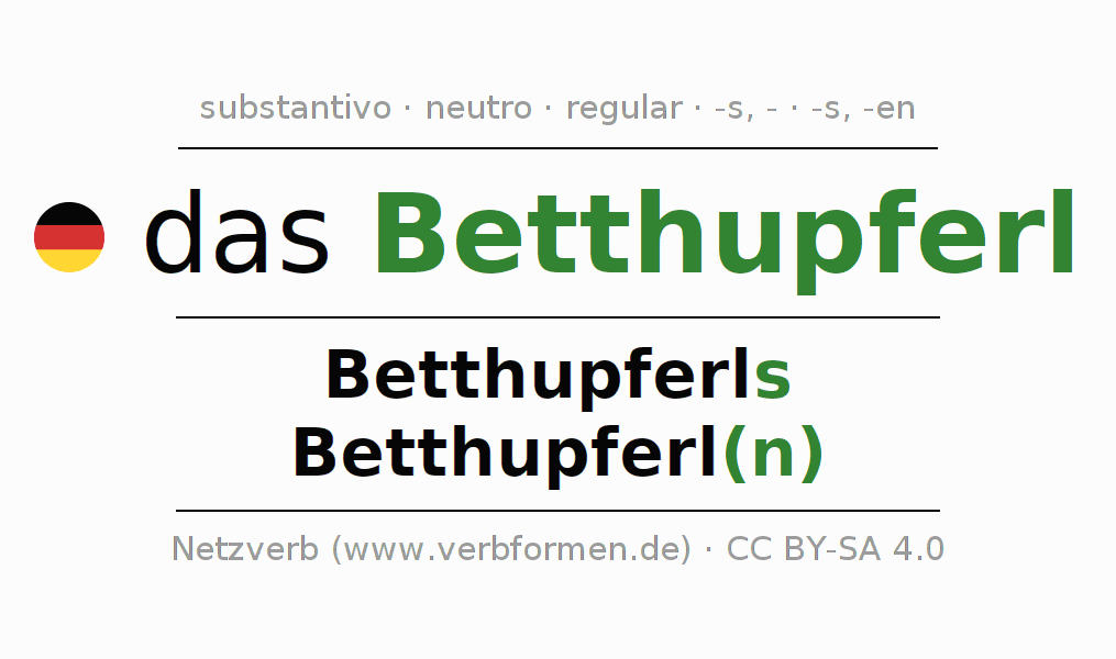 A declinação do substantivo Betthupferl (conto, filme curto) está no genitivo singular Betthupferls e no nominativo plural Betthupferl(n) . O substantivo forte Betthupferl é declinado com a terminação s/-/n. O gênero gramatical de Betthupferl é neutro e o artigo definido é "das". Não se pode somente declinar o substantivo Betthupferl mas sim todos os substantivos em alemão. Comentários ☆