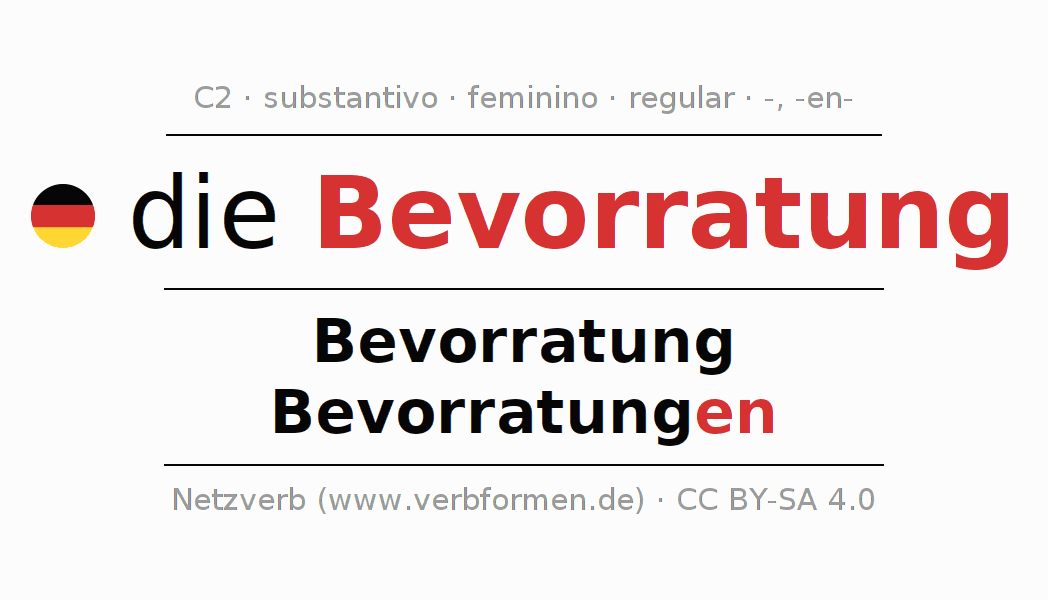A declinação do substantivo Bevorratung (armazenamento, estoque) está no genitivo singular Bevorratung e no nominativo plural Bevorratungen . O substantivo fraco Bevorratung é declinado com a terminação -/en. O gênero gramatical de Bevorratung é feminino e o artigo definido é "die". Não se pode somente declinar o substantivo Bevorratung mas sim todos os substantivos em alemão. O substantivo faz parte do vocabulário referente ao Certificado em Alemão do Nível C2. Comentários ☆