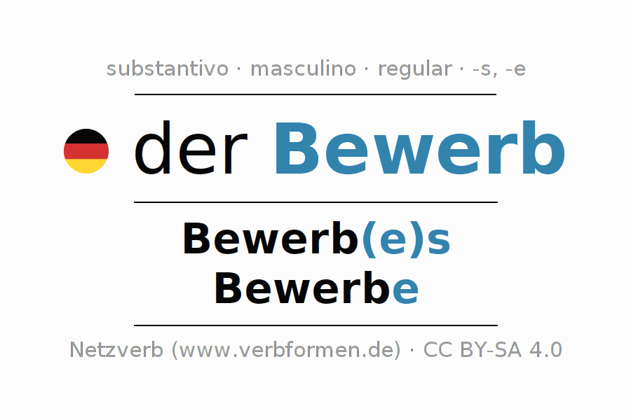 A declinação do substantivo Bewerb (competição, concurso) está no genitivo singular Bewerb(e)s e no nominativo plural Bewerbe . O substantivo forte Bewerb é declinado com a terminação es/e. O gênero gramatical de Bewerb é masculino e o artigo definido é 'der'. Não se pode somente declinar o substantivo Bewerb mas sim todos os substantivos em alemão. Comentários ☆