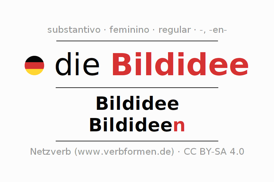 A declinação do substantivo Bildidee (conceito visual, ideia de imagem) está no genitivo singular Bildidee e no nominativo plural Bildideen . O substantivo fraco Bildidee é declinado com a terminação -/n. O gênero gramatical de Bildidee é feminino e o artigo definido é "die". Não se pode somente declinar o substantivo Bildidee mas sim todos os substantivos em alemão. Comentários ☆