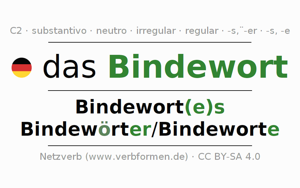 Declinação de Bindewort é apresentada em uma tabela com todas as formas no singular e no plural (plural) e em todos os quatro casos: nominativo (1º caso), genitivo (2º caso), dativo (3º caso) e acusativo (4º caso) . Especialmente para os alunos de alemão, a correta declinação da palavra Bindewort é fundamental.
