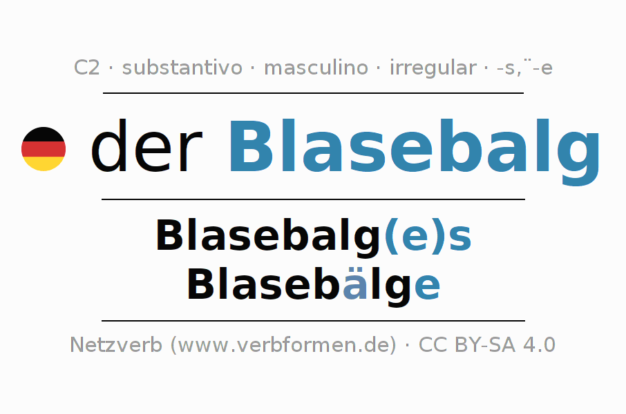 Declinação de Blasebalg é apresentada em uma tabela com todas as formas no singular e no plural (plural) e em todos os quatro casos: nominativo (1º caso), genitivo (2º caso), dativo (3º caso) e acusativo (4º caso) . Especialmente para os alunos de alemão, a correta declinação da palavra Blasebalg é fundamental.