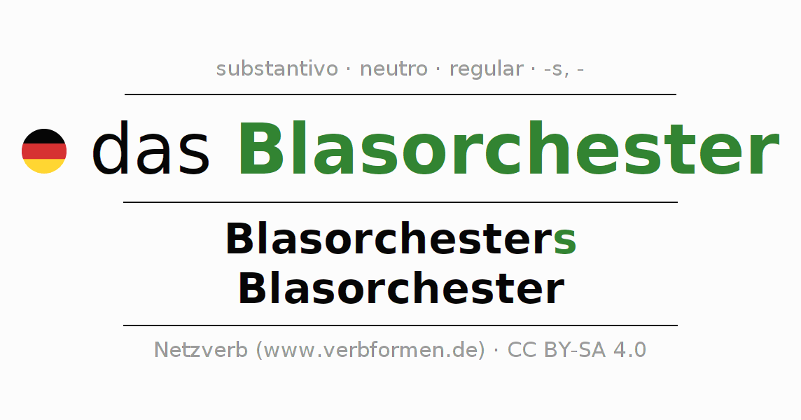 A declinação do substantivo Blasorchester (orquestra de sopros) está no genitivo singular Blasorchesters e no nominativo plural Blasorchester . O substantivo forte Blasorchester é declinado com a terminação s/-. O gênero gramatical de Blasorchester é neutro e o artigo definido é "das". Não se pode somente declinar o substantivo Blasorchester mas sim todos os substantivos em alemão. Comentários ☆