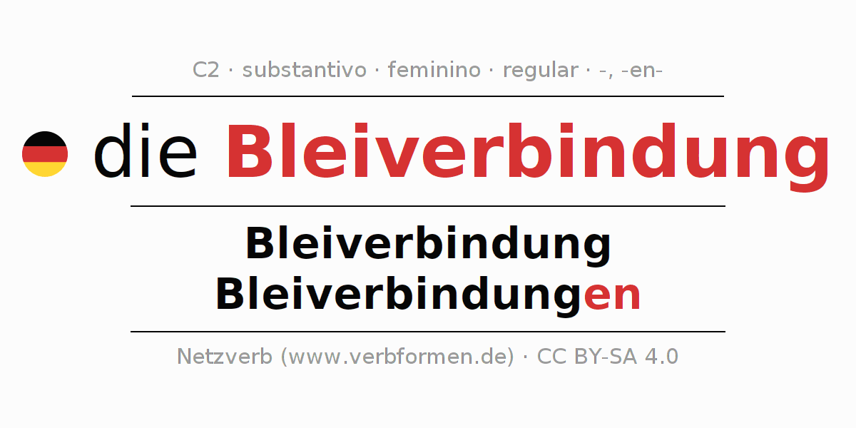Declinação de Bleiverbindung é apresentada em uma tabela com todas as formas no singular e no plural (plural) e em todos os quatro casos: nominativo (1º caso), genitivo (2º caso), dativo (3º caso) e acusativo (4º caso) . Especialmente para os alunos de alemão, a correta declinação da palavra Bleiverbindung é fundamental.