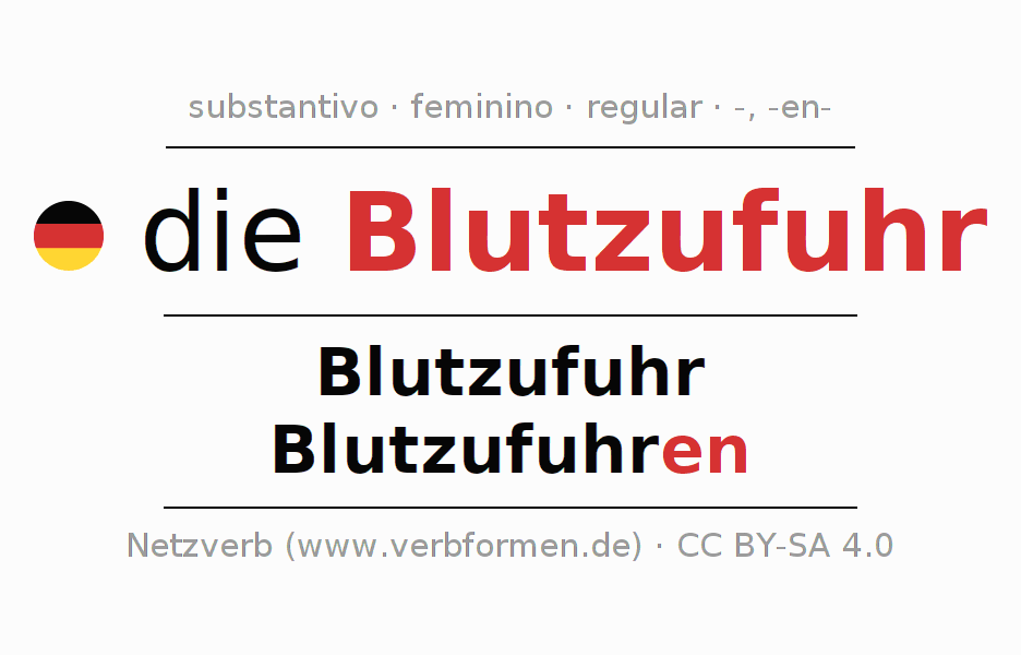 Declinação de Blutzufuhr é apresentada em uma tabela com todas as formas no singular e no plural (plural) e em todos os quatro casos: nominativo (1º caso), genitivo (2º caso), dativo (3º caso) e acusativo (4º caso) . Especialmente para os alunos de alemão, a correta declinação da palavra Blutzufuhr é fundamental.