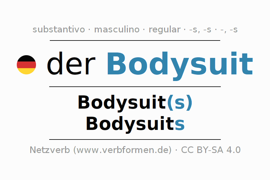 A declinação do substantivo Bodysuit (body, collant) está no genitivo singular Bodysuit(s) e no nominativo plural Bodysuits . O substantivo forte Bodysuit é declinado com a terminação s/-/s. O gênero gramatical de Bodysuit é masculino e o artigo definido é 'der'. Não se pode somente declinar o substantivo Bodysuit mas sim todos os substantivos em alemão. Comentários ☆