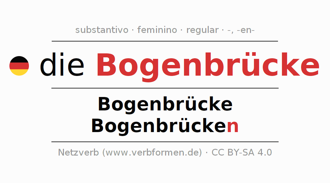 A declinação do substantivo Bogenbrücke (ponte arqueada) está no genitivo singular Bogenbrücke e no nominativo plural Bogenbrücken . O substantivo fraco Bogenbrücke é declinado com a terminação -/n. O gênero gramatical de Bogenbrücke é feminino e o artigo definido é "die". Não se pode somente declinar o substantivo Bogenbrücke mas sim todos os substantivos em alemão. Comentários ☆