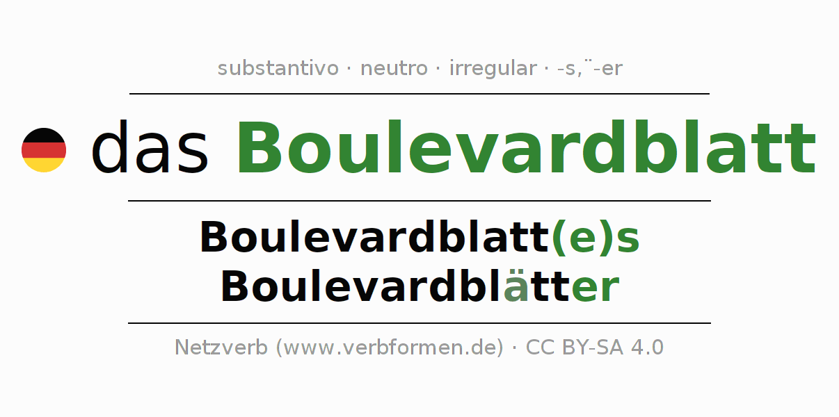 A declinação do substantivo Boulevardblatt (jornal sensacionalista, revista de fofocas) está no genitivo singular Boulevardblatt(e)s e no nominativo plural Boulevardblätter . O substantivo forte Boulevardblatt é declinado com a terminação es/ä-er. No plural com um trema. O gênero gramatical de Boulevardblatt é neutro e o artigo definido é "das". Não se pode somente declinar o substantivo Boulevardblatt mas sim todos os substantivos em alemão. Comentários ☆