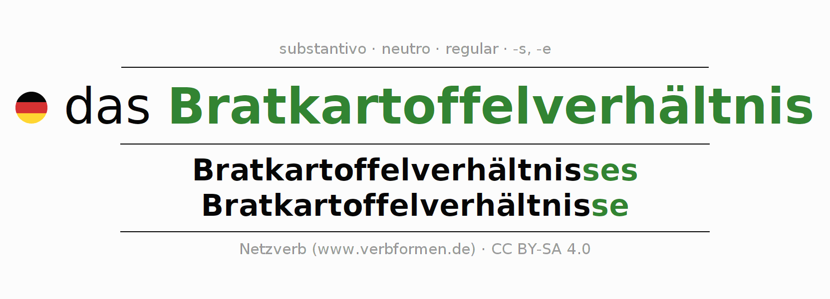 A declinação do substantivo Bratkartoffelverhältnis (relação casual, relação de troca) está no genitivo singular Bratkartoffelverhältnisses e no nominativo plural Bratkartoffelverhältnisse . O substantivo forte Bratkartoffelverhältnis é declinado com a terminação ses/se. O gênero gramatical de Bratkartoffelverhältnis é neutro e o artigo definido é "das". Não se pode somente declinar o substantivo Bratkartoffelverhältnis mas sim todos os substantivos em alemão. Comentários ☆