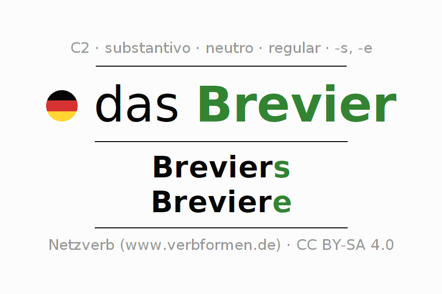A declinação do substantivo Brevier (breviário, guia) está no genitivo singular Breviers e no nominativo plural Breviere . O substantivo forte Brevier é declinado com a terminação s/e. O gênero gramatical de Brevier é neutro e o artigo definido é "das". Não se pode somente declinar o substantivo Brevier mas sim todos os substantivos em alemão. O substantivo faz parte do vocabulário referente ao Certificado em Alemão do Nível C2. Comentários ☆