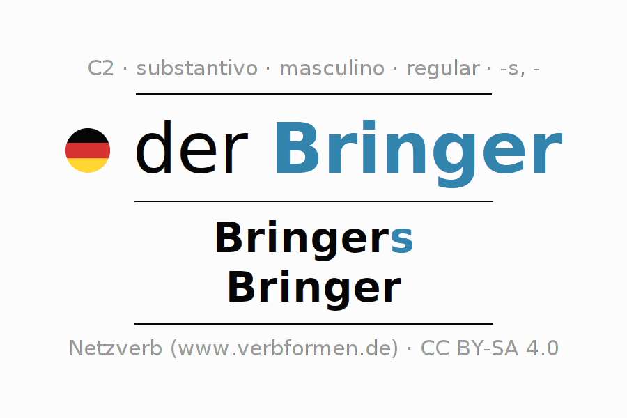 Declinação de Bringer é apresentada em uma tabela com todas as formas no singular e no plural (plural) e em todos os quatro casos: nominativo (1º caso), genitivo (2º caso), dativo (3º caso) e acusativo (4º caso) . Especialmente para os alunos de alemão, a correta declinação da palavra Bringer é fundamental.