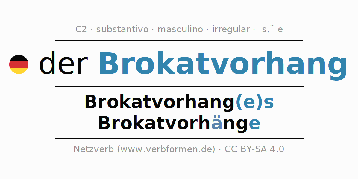 Declinação de Brokatvorhang é apresentada em uma tabela com todas as formas no singular e no plural (plural) e em todos os quatro casos: nominativo (1º caso), genitivo (2º caso), dativo (3º caso) e acusativo (4º caso) . Especialmente para os alunos de alemão, a correta declinação da palavra Brokatvorhang é fundamental.