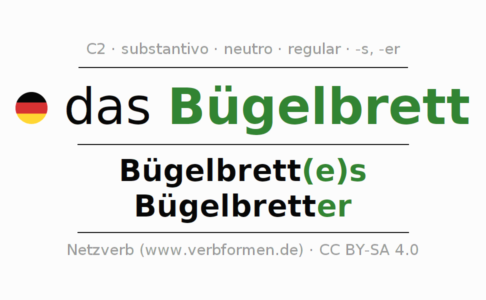Declinação de Bügelbrett é apresentada em uma tabela com todas as formas no singular e no plural (plural) e em todos os quatro casos: nominativo (1º caso), genitivo (2º caso), dativo (3º caso) e acusativo (4º caso) . Especialmente para os alunos de alemão, a correta declinação da palavra Bügelbrett é fundamental.