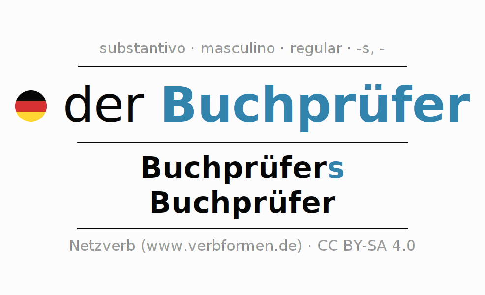 A declinação do substantivo Buchprüfer (auditor, revisor) está no genitivo singular Buchprüfers e no nominativo plural Buchprüfer . O substantivo forte Buchprüfer é declinado com a terminação s/-. O gênero gramatical de Buchprüfer é masculino e o artigo definido é 'der'. Não se pode somente declinar o substantivo Buchprüfer mas sim todos os substantivos em alemão. Comentários ☆