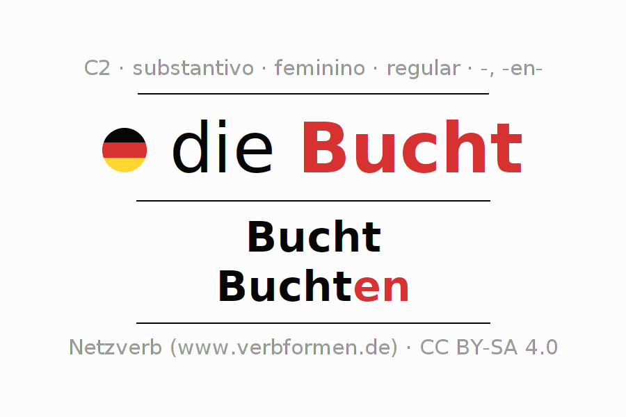 Declinação de Bucht é apresentada em uma tabela com todas as formas no singular e no plural (plural) e em todos os quatro casos: nominativo (1º caso), genitivo (2º caso), dativo (3º caso) e acusativo (4º caso) . Especialmente para os alunos de alemão, a correta declinação da palavra Bucht é fundamental.