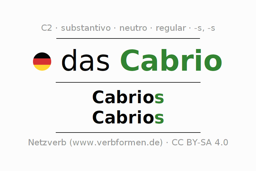 - Singular: das Cabrio, des Cabrios, dem Cabrio, das Cabrio