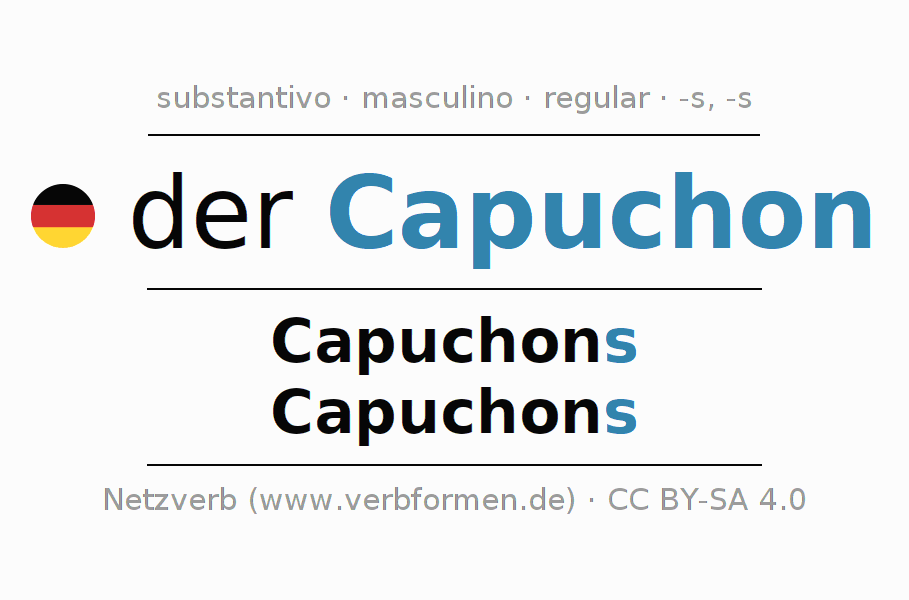 A declinação do substantivo Capuchon está no genitivo singular Capuchons e no nominativo plural Capuchons . O substantivo forte Capuchon é declinado com a terminação s/s. O gênero gramatical de Capuchon é masculino e o artigo definido é 'der'. Não se pode somente declinar o substantivo Capuchon mas sim todos os substantivos em alemão. Comentários ☆