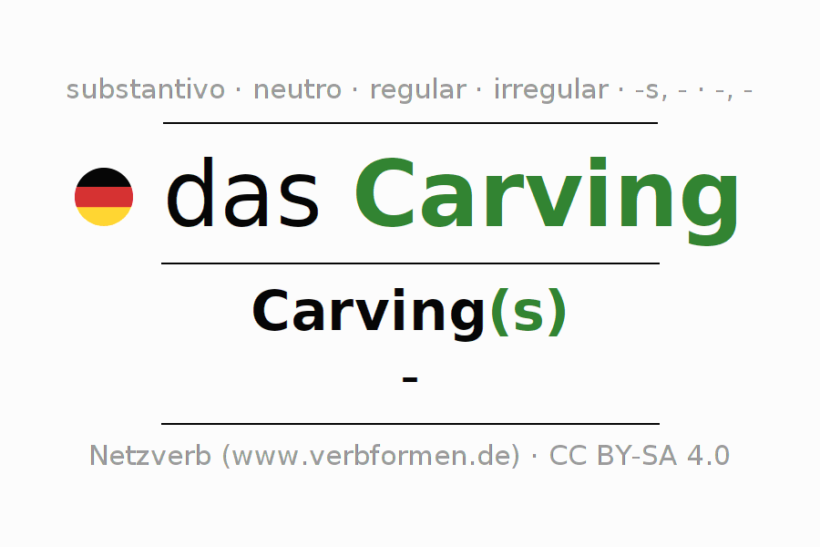 A declinação do substantivo Carving está no genitivo singular Carving(s) e no nominativo plural - . O substantivo forte Carving é declinado com a terminação s/-/-. Não há formas no plural. O gênero gramatical de Carving é neutro e o artigo definido é "das". Não se pode somente declinar o substantivo Carving mas sim todos os substantivos em alemão. Comentários ☆