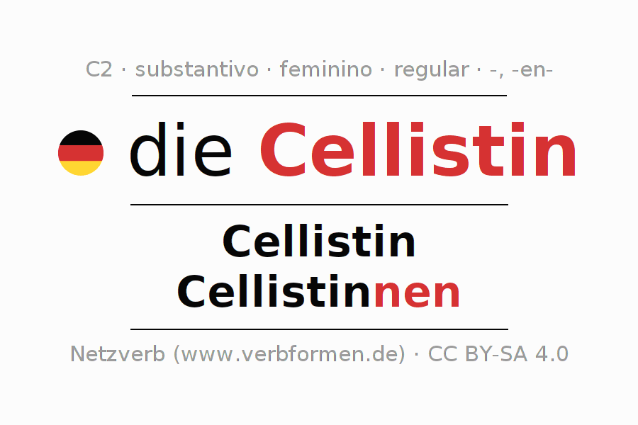 Declinação de Cellistin é apresentada em uma tabela com todas as formas no singular e no plural (plural) e em todos os quatro casos: nominativo (1º caso), genitivo (2º caso), dativo (3º caso) e acusativo (4º caso) . Especialmente para os alunos de alemão, a correta declinação da palavra Cellistin é fundamental.