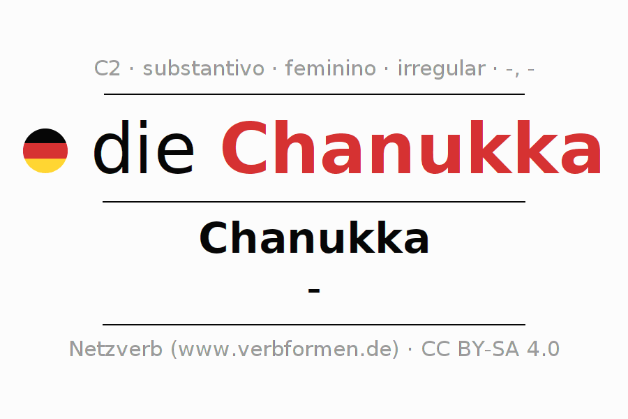 Declinação de Chanukka é apresentada em uma tabela com todas as formas no singular e no plural (plural) e em todos os quatro casos: nominativo (1º caso), genitivo (2º caso), dativo (3º caso) e acusativo (4º caso) . Especialmente para os alunos de alemão, a correta declinação da palavra Chanukka é fundamental.
