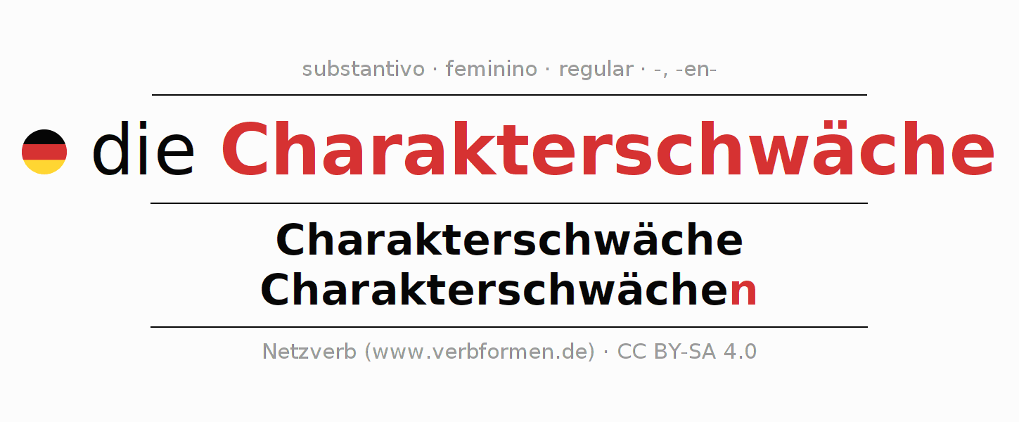 A declinação do substantivo Charakterschwäche (fraqueza de caráter, falta de caráter) está no genitivo singular Charakterschwäche e no nominativo plural Charakterschwächen . O substantivo fraco Charakterschwäche é declinado com a terminação -/n. O gênero gramatical de Charakterschwäche é feminino e o artigo definido é "die". Não se pode somente declinar o substantivo Charakterschwäche mas sim todos os substantivos em alemão. Comentários ☆