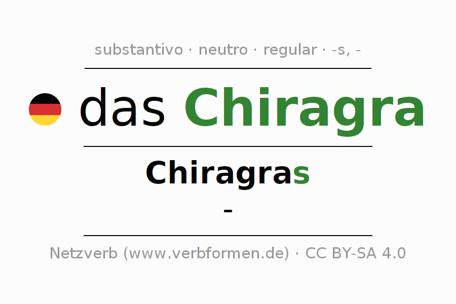 A declinação do substantivo Chiragra (gota da mão) está no genitivo singular Chiragras e no nominativo plural - . O substantivo forte Chiragra é declinado com a terminação s/-. Não há formas no plural. O gênero gramatical de Chiragra é neutro e o artigo definido é "das". Não se pode somente declinar o substantivo Chiragra mas sim todos os substantivos em alemão. Comentários ☆