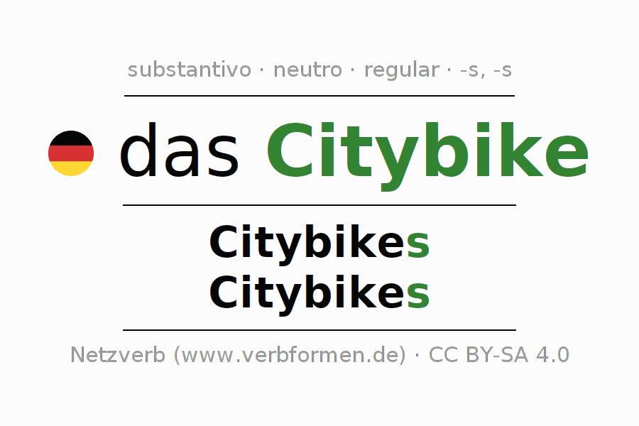 A declinação do substantivo Citybike (bicicleta de cidade, bicicleta urbana) está no genitivo singular Citybikes e no nominativo plural Citybikes . O substantivo forte Citybike é declinado com a terminação s/s. O gênero gramatical de Citybike é neutro e o artigo definido é "das". Não se pode somente declinar o substantivo Citybike mas sim todos os substantivos em alemão. Comentários ☆
