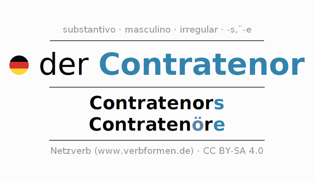 A declinação do substantivo Contratenor está no genitivo singular Contratenors e no nominativo plural Contratenöre . O substantivo forte Contratenor é declinado com a terminação s/ö-e. No plural com um trema. O gênero gramatical de Contratenor é masculino e o artigo definido é 'der'. Não se pode somente declinar o substantivo Contratenor mas sim todos os substantivos em alemão. Comentários ☆