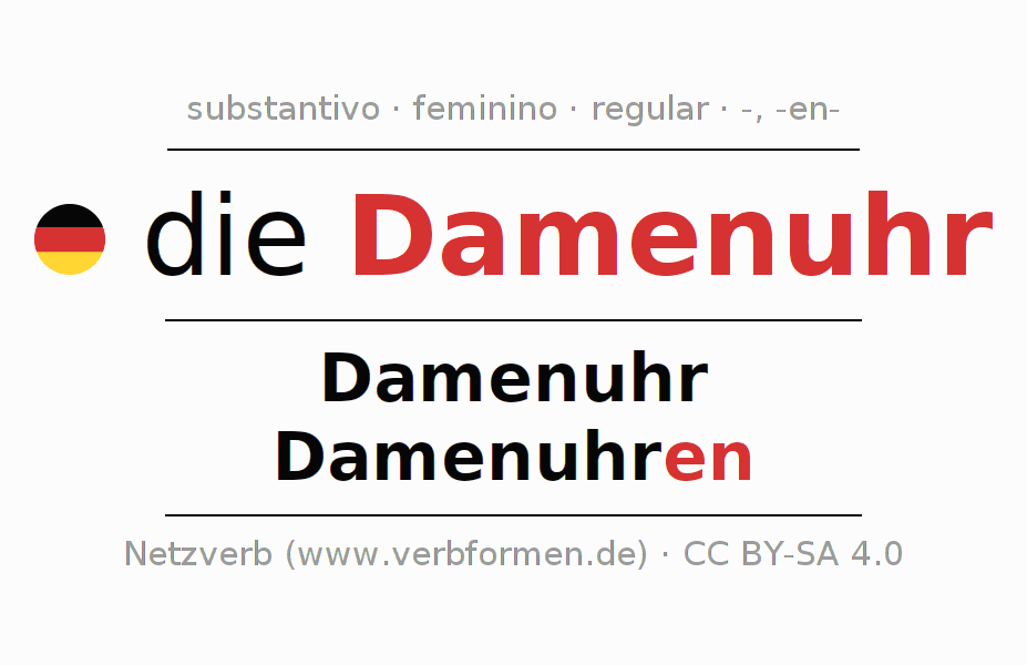 A declinação do substantivo Damenuhr (relógio feminino) está no genitivo singular Damenuhr e no nominativo plural Damenuhren . O substantivo fraco Damenuhr é declinado com a terminação -/en. O gênero gramatical de Damenuhr é feminino e o artigo definido é "die". Não se pode somente declinar o substantivo Damenuhr mas sim todos os substantivos em alemão. Comentários ☆