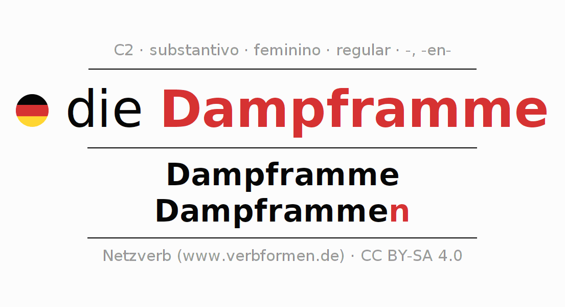 Declinação de Dampframme é apresentada em uma tabela com todas as formas no singular e no plural (plural) e em todos os quatro casos: nominativo (1º caso), genitivo (2º caso), dativo (3º caso) e acusativo (4º caso) . Especialmente para os alunos de alemão, a correta declinação da palavra Dampframme é fundamental.